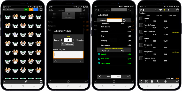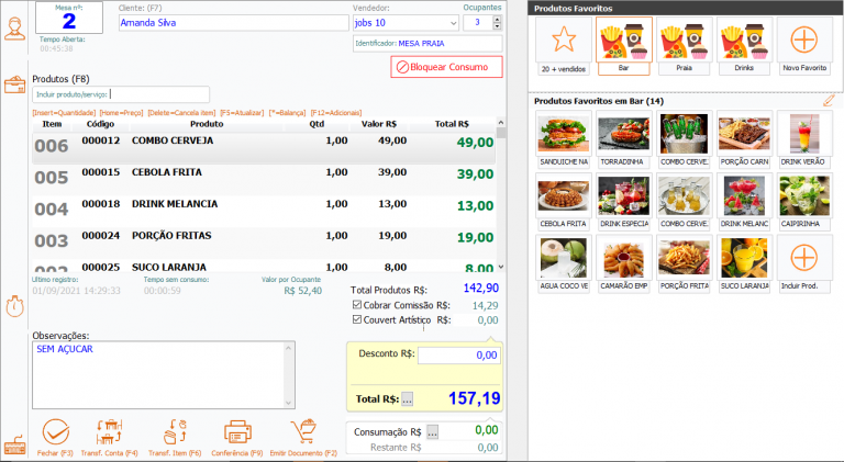 - Seleção prévia do garçom, comissão, couvert artístico, entre outros